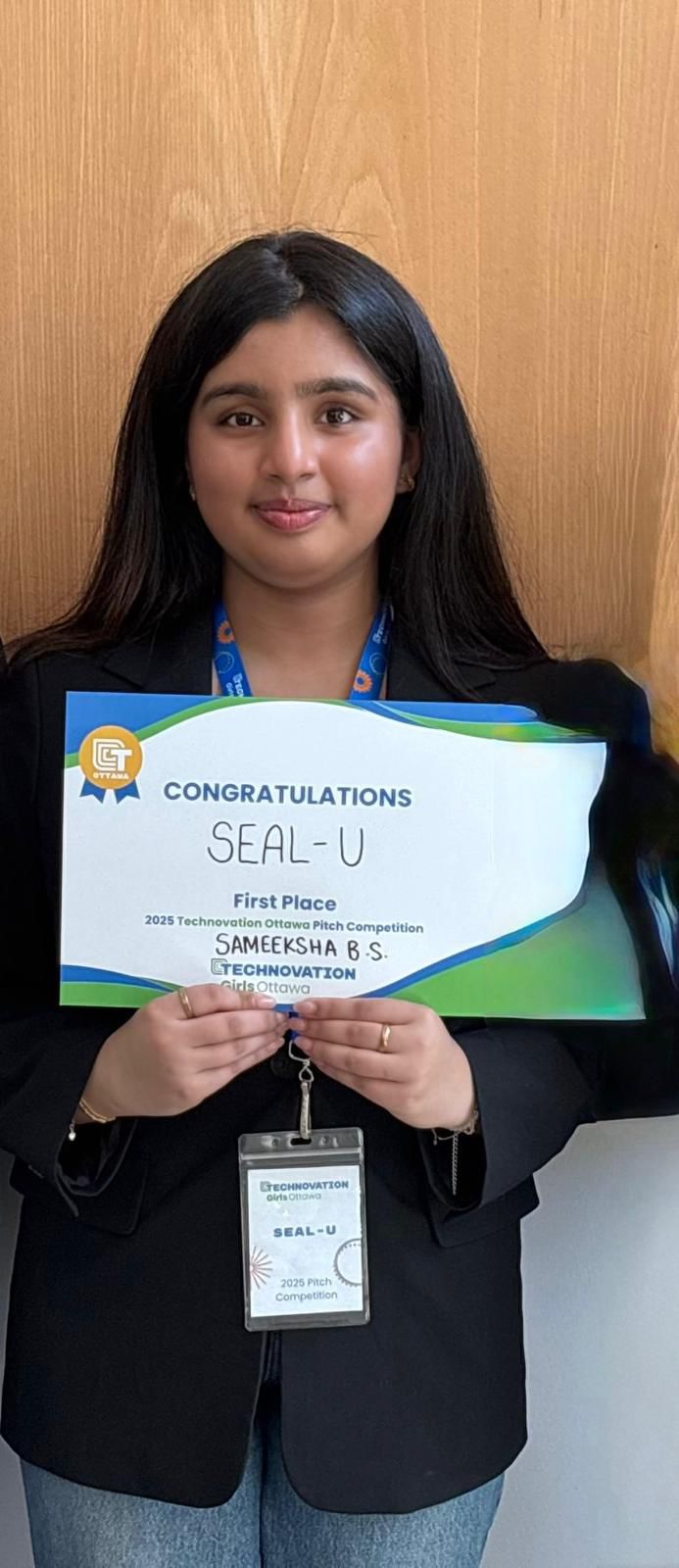 Sam and team were the winners of the 2025 TECHNOVATION OTTAWA competition hosted by Carleton University in the Senior Category for designing Seal-U, an app designed to help high school volunteers connect with peers who share similar interests while supporting local schools. The app makes it easier for students to find volunteer opportunities, build connections, and engage meaningfully with their community. With a focus on sustainability and safety, Seal-U encourages collaboration and social connection among youth through a simple, user-friendly platform.